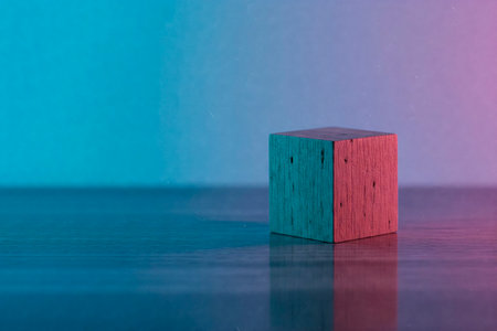 Wooden cube in two-tone lighting. Space for text