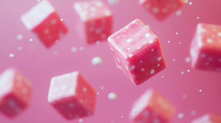 A collection of floating, pink-colored cubes with white polka dots are scattered across a vibrant pink background, creating a playful and dreamy effect.