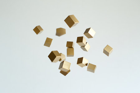 floating cubes in gold, gently rotating against a pure white backdrop, creating a minimalist and modern feel.