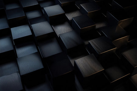 A precise arrangement of stacked geometric cubes crafted from carbon fiber, featuring glowing golden edges, creating a structured and futuristic visual formation.
