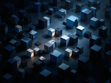 A close-up of metallic cubes in dark tones arranged in a grid pattern. The various shades and subtle textures create an industrial, futuristic feel.