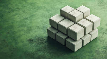 This image showcases an abstract arrangement of concrete blocks on a vibrant green surface, highlighting geometric shapes and minimalistic design principles.