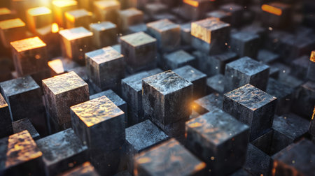 Abstract close-up of textured cubes arranged in a pattern, showcasing intricate details and various shades under soft lighting. Generative AI