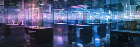 Modern office interior with night city view. Panoramic banner.