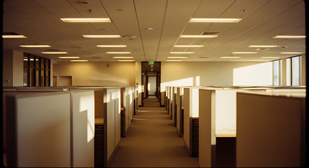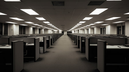 A long, empty office space filled with cubicles under fluorescent lighting, creating a minimalist and somewhat somber atmosphere.