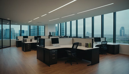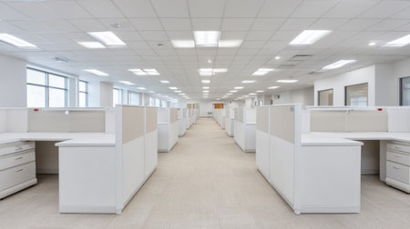 Bright and minimalist office interior showcasing empty cubicles, ample natural light, and a clean design, ideal for business environments and modern workplaces.