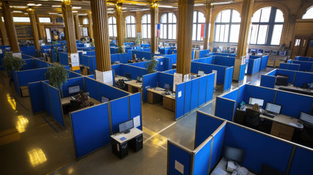 An office space filled with numerous blue cubicles, each containing a workstation. The setting is bustling with activity as employees work diligently at their desks.