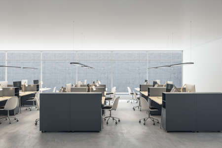 Interior of modern open space office with rows of computer tables and chairs