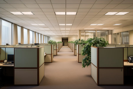 An empty office space with cubicles, old computers, and a few plants, showcasing a quiet and organized work environment
