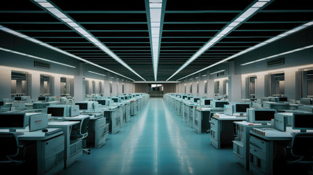 A spacious, empty office with rows of cubicles, each equipped with an old computer monitor and keyboard. The room has a clean, minimalist design with fluorescent lighting.