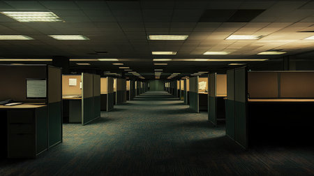 Rows of cubicles in a dark, abandoned office building, flickering lights casting eerie shadows across dusty surfaces