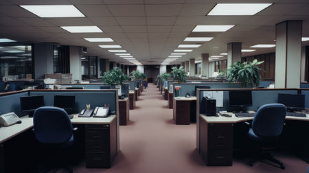 a row of empty office cubicles with computers and chairs, created with generative ai