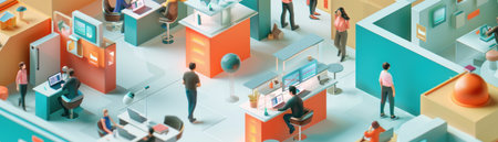A 3D illustrated snapshot of a business in motion bustling with activity as professionals meet strategize and innovate