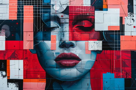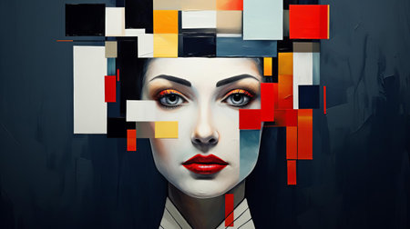 An abstract portrait of beautiful young woman with red lip in cubism art. Close up fashionable female or girl with vibrant color and artistic creative geometric shape. Focus on face concept. AIG42.
