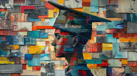 Graduate Silhouette in Artistic Collage of Vibrant Painted Wood Panels