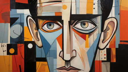 An abstract portrait of middle aged people with wrinkle on face in cubism art. Close up fashionable old man with vibrant color and artistic creative geometric shape. Focus on face concept. AIG42.