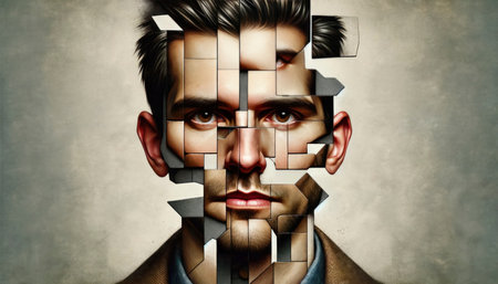 Young woman with face pieces detached, symbolizing prosopagnosia or face blindness diagnosis, portraying distorted memory and identity.