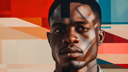 An expressionistic portrait of a person with shadowy triangles of teal and magenta slicing across their features. The geometric shapes create an intriguing visual tension.