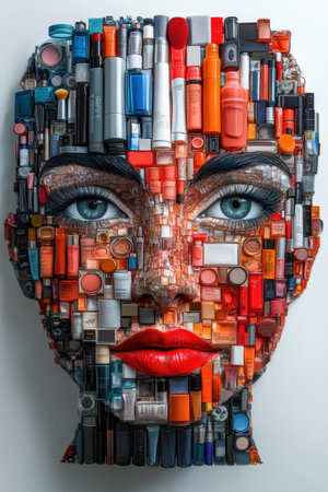 Cosmetic products are creatively arranged to mimic a face, showing bold colors and artistic design. This unique collage highlights an innovative approach to beauty and art, captivating viewers.