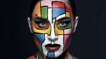 Stunning Geometric Facial Art Design with Vibrant Colors Highlighting Modern Beauty Trends in Women
