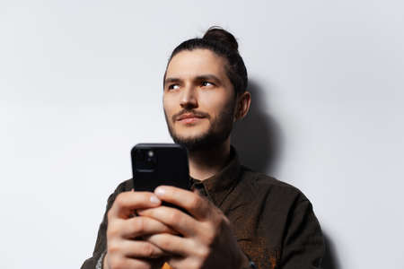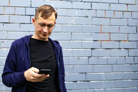 Street portrait of a modern young man with a mobile phone on brick wall background