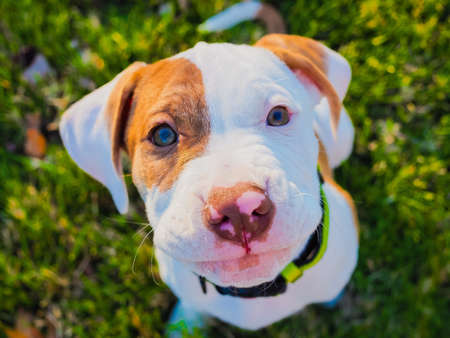 Mystified blue American Bully puppy curiously walking forward with its mouth.