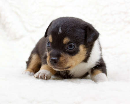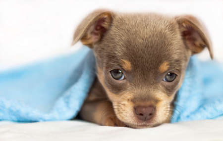 chihuahua puppy. The puppy lies on the bed under a blue blanket. Dog looking at the camera. Banner