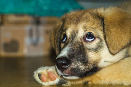 Close-up portrait of a cute mongrel light brown puppy with sad eyes with copy space