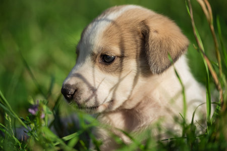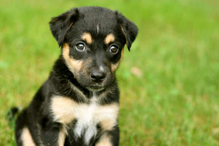 Portrait young dog playing in the meadow. Little Puppy of the Caucasian Sheepdog