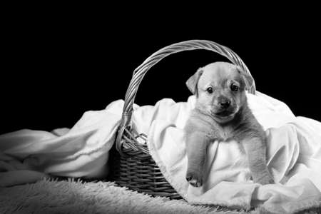 A beautiful puppy in a wicker basket on a white blanket. Studio photo on a black background. Horizontally framed shot.