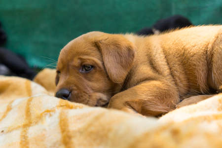 5 week old labrador puppy lying in his bench on a blanket sleeping