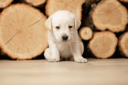 Cute puppy on a wooden table. Studio photo on a black background. Horizontally framed shot.