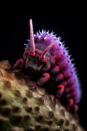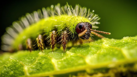 Macro of Painted Jezebel (Delias hyparete) caterpillars on their host plant leaf in nature,Butterfly worm, Low key and selective focus, Colroful.