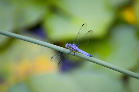 Dragonfly Perch Against Blurry Background Elongated Wings, Colorful Body, Large Eyes Amidst Bokeh Effects
