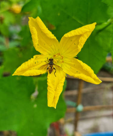 beauty yellow flower blooming star shape and nice bee cucumber organic healthy vegetable in botany garden with copy space.