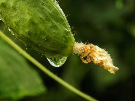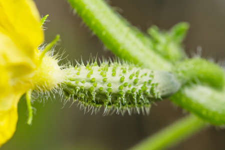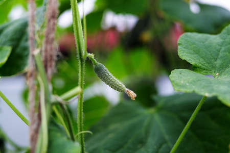 Young green cucumber in a greenhouse, macro photo, shallow depth of field. Harvesting autumn vegetables. Healthy food concept, vegetarian diet of raw fresh food. Non-GMO organic food.