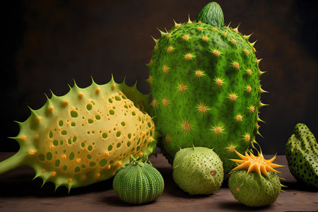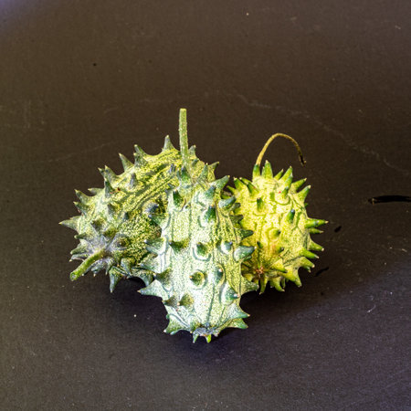 With fresh green fruit coated with horn like spines, horned melon, Cucumis metuliferus, Kiwano, African horned cucumber, jelly melon, hedged gourd, or Melano annual vine plants are cultivated