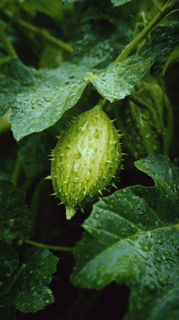 Horned melon in gentle light rain, soft raindrops visible on vivid green leaves, natural realistic style, bright fresh colors, balanced wide composition, cinematic framing, highly detailed.