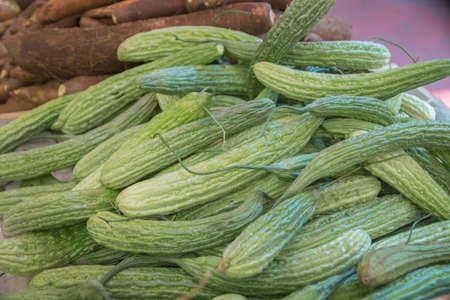 A pile of fresh Bitter Melon fruits (Momordica charantia), widely used in the cuisines of East Asia, South Asia, and Southeast Asia, presented for sale at a market stand.