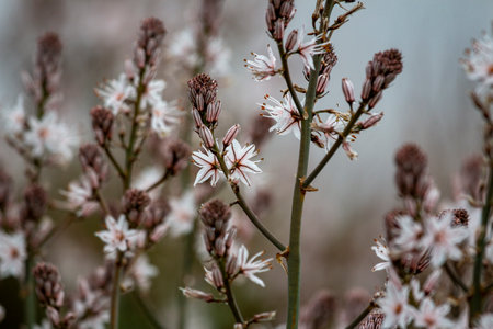 A close-up shot of a plant with small, white flowers isolated on a blurred background