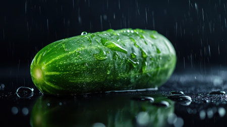 Slices of cucumber glisten with moisture, showing their vibrant green color and textured surface against a dark backdrop. The freshness is highlighted by the water droplets.