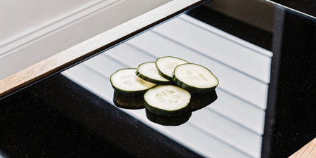 Cucumber slices arranged decoratively on a marble kitchen worktop
