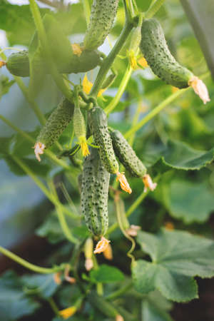 Homemade cucumbers grow on stems. Selective focus. nature.