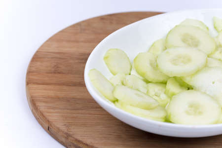Sliced cucumber on a wooden board, close-up
