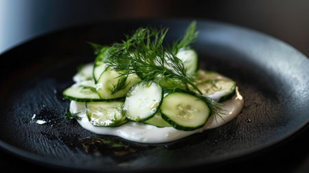 A visually appealing cucumber salad featuring thinly sliced cucumbers and fresh dill on a black plate, showcasing simplicity and freshness in healthy dining.