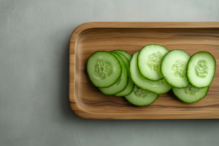 Fresh cucumber slices arranged on a wooden tray