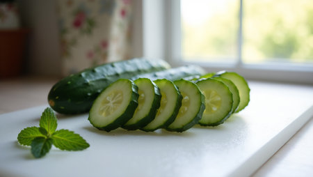 Fresh cucumber slices on cutting board with mint sprig bathed in natural light