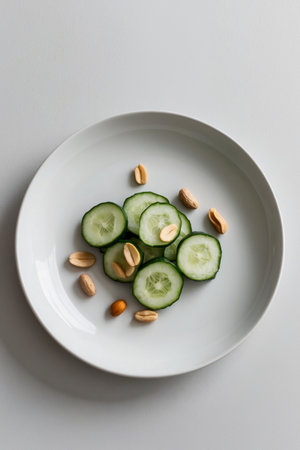 AI Generated. A white plate topped with sliced cucumbers and peanuts