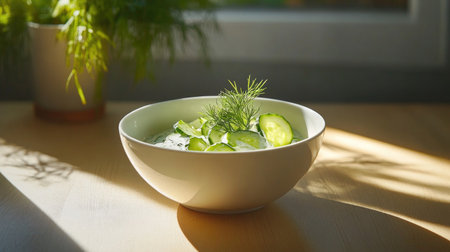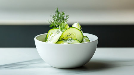 A beautifully presented bowl of freshly sliced cucumbers mixed with creamy yogurt and garnished with dill, highlighting healthy eating.