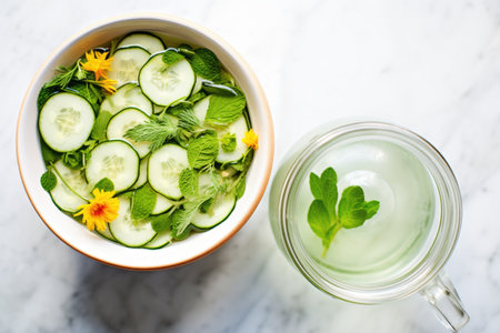 top-down shot, jug of cucumber mint water surrounded by fresh cucumbers and mint leaves